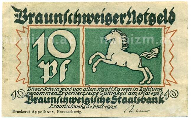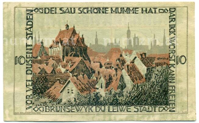 Банкнота 10 пфеннигов 1921 года Германия — Брауншвейг (Нотгельд) (Артикул: K10-12765): подробные характеристики, качественные фотографии в высоком разрешении, низкая цена.