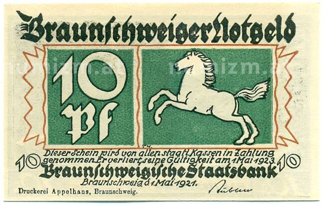 Банкнота 10 пфеннигов 1921 года Германия — Брауншвейг (Нотгельд) (Артикул: K10-12772): подробные характеристики, качественные фотографии в высоком разрешении, низкая цена.