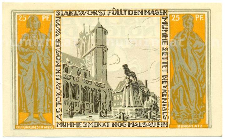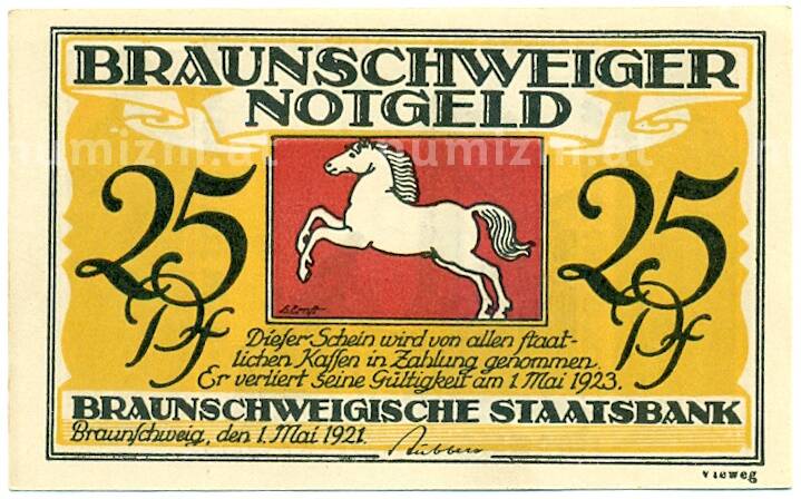 Банкнота 25 пфеннигов 1921 года Германия — Брауншвейг (Нотгельд) (Артикул: K10-12773): подробные характеристики, качественные фотографии в высоком разрешении, низкая цена.
