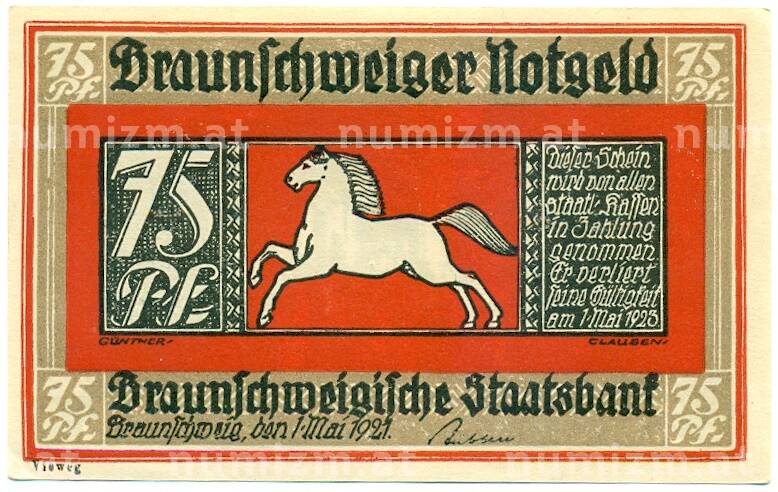 Банкнота 75 пфеннигов 1921 года Германия — Брауншвейг (Нотгельд) (Артикул: K10-12776): подробные характеристики, качественные фотографии в высоком разрешении, низкая цена.
