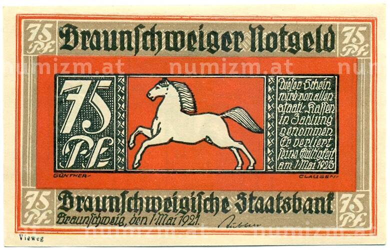 Банкнота 75 пфеннигов 1921 года Германия — Брауншвейг (Нотгельд) (Артикул: K10-12779): подробные характеристики, качественные фотографии в высоком разрешении, низкая цена.
