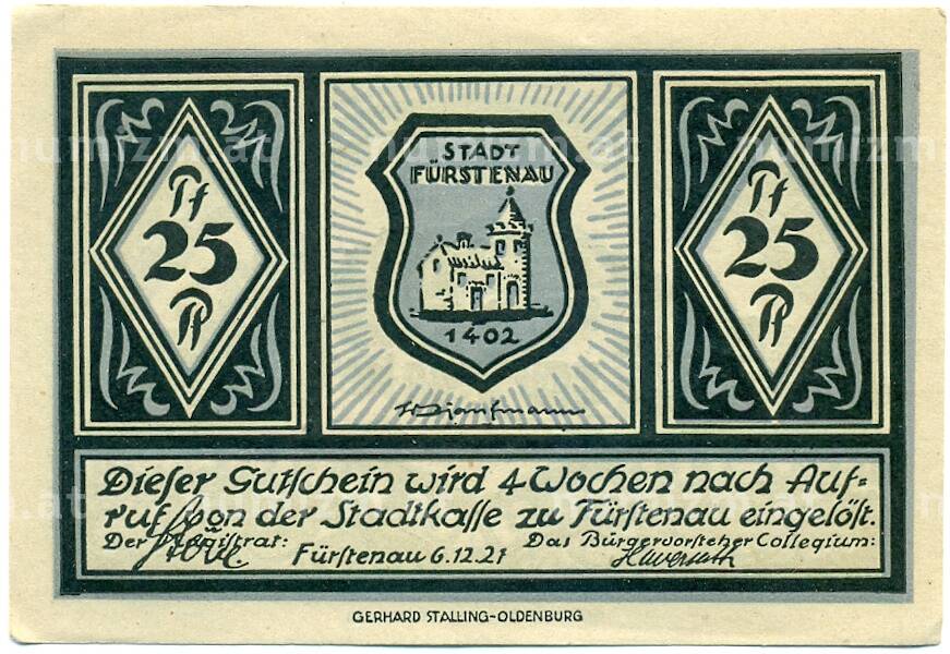 Купить 25 пфеннигов 1921 года Германия — Фюрстенау (Нотгельд) по привлекательной цене можно в нашем интернет-магазине — Вам достаточно оформить заказ на сайте. Все монеты, представленные в каталоге, находятся в наличии на нашем складе.