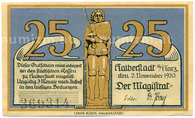 Купить 25 пфеннигов 1921 года Германия — Хальберштадт (Нотгельд) по привлекательной цене можно в нашем интернет-магазине — Вам достаточно оформить заказ на сайте. Все монеты, представленные в каталоге, находятся в наличии на нашем складе.