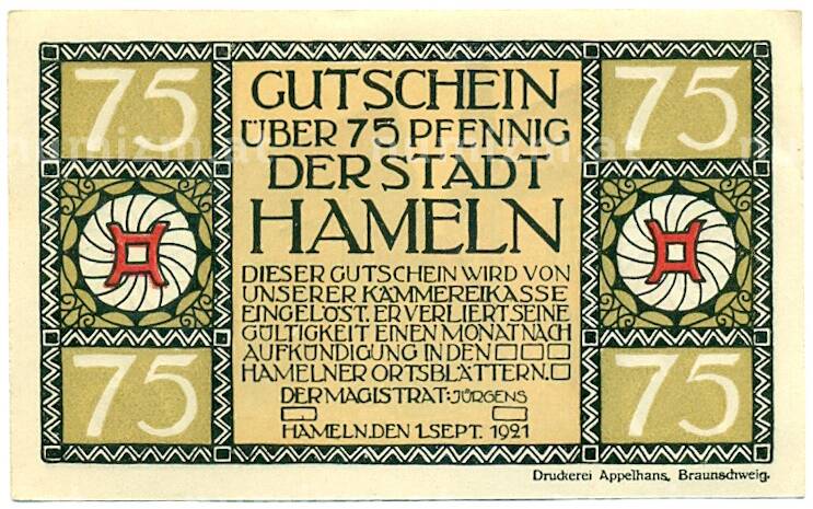 Купить 75 пфеннигов 1921 года Германия — Хамельн (Нотгельд) по привлекательной цене можно в нашем интернет-магазине — Вам достаточно оформить заказ на сайте. Все монеты, представленные в каталоге, находятся в наличии на нашем складе.