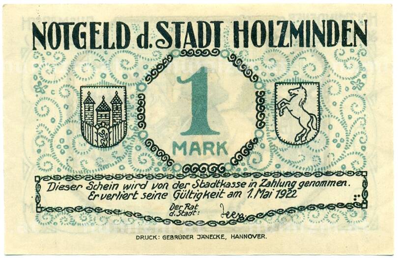 Банкнота 1 марка 1922 года Германия — Хольцминден (Нотгельд) (Артикул: K10-12800): подробные характеристики, качественные фотографии в высоком разрешении, низкая цена.
