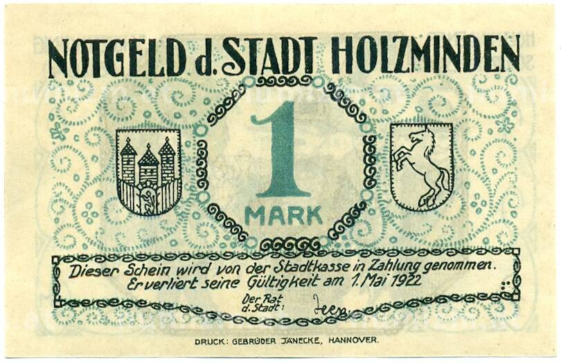 Банкнота 1 марка 1922 года Германия — Хольцминден (Нотгельд) (Артикул: K10-12802): подробные характеристики, качественные фотографии в высоком разрешении, низкая цена.
