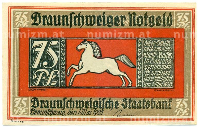 Банкнота 75 пфеннигов 1921 года Германия — Брауншвейг (Нотгельд) (Артикул: K10-12806): подробные характеристики, качественные фотографии в высоком разрешении, низкая цена.