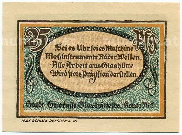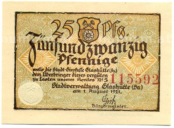 Купить 25 пфеннигов 1921 года Германия — Гласхютте (Баден) Нотгельд по привлекательной цене можно в нашем интернет-магазине — Вам достаточно оформить заказ на сайте. Все монеты, представленные в каталоге, находятся в наличии на нашем складе.