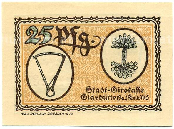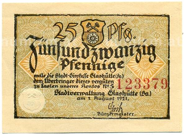 Банкнота 25 пфеннигов 1921 года Германия — Гласхютте (Баден) Нотгельд (Артикул: K10-12835): подробные характеристики, качественные фотографии в высоком разрешении, низкая цена.
