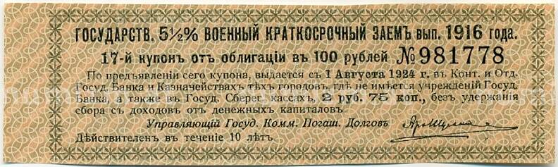 Купон от облигации 100 рублей 1916 года «Государственный военный краткосрочный заем» (Артикул: K10-12855): подробные характеристики, качественные фотографии в высоком разрешении, низкая цена.