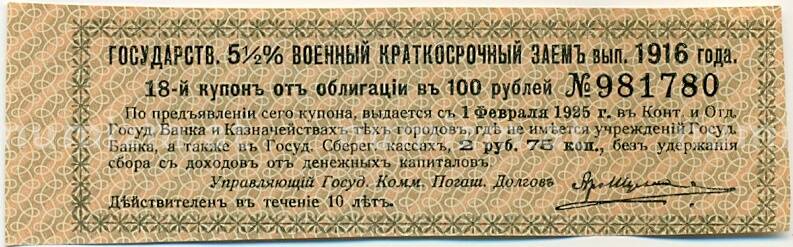 Купон от облигации 100 рублей 1916 года «Государственный военный краткосрочный заем» (Артикул: K10-12856): подробные характеристики, качественные фотографии в высоком разрешении, низкая цена.