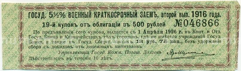 Купон от облигации 500 рублей 1916 года «Государственный военный краткосрочный заем» (Артикул: K10-12858): подробные характеристики, качественные фотографии в высоком разрешении, низкая цена.