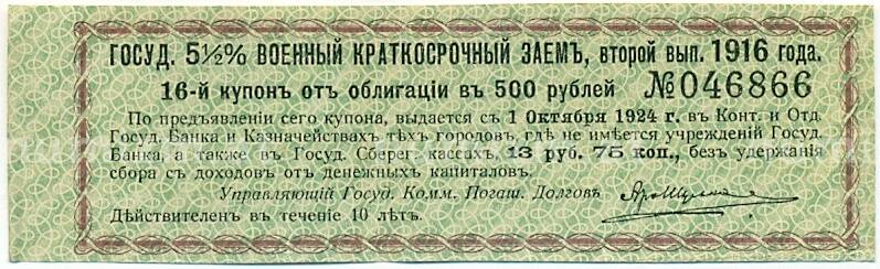 Купон от облигации 500 рублей 1916 года «Государственный военный краткосрочный заем» (Артикул: K10-12860): подробные характеристики, качественные фотографии в высоком разрешении, низкая цена.