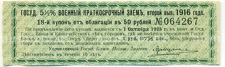 Купон от облигации 50 рублей 1916 года «Государственный военный краткосрочный заем» (Артикул: K10-12865): подробные характеристики, качественные фотографии в высоком разрешении, низкая цена.