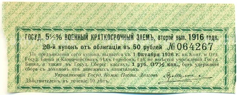 Купон от облигации 50 рублей 1916 года «Государственный военный краткосрочный заем» (Артикул: K10-12866): подробные характеристики, качественные фотографии в высоком разрешении, низкая цена.