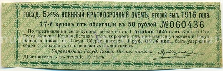 Купон от облигации 50 рублей 1916 года «Государственный военный краткосрочный заем» (Артикул: K10-12868): подробные характеристики, качественные фотографии в высоком разрешении, низкая цена.