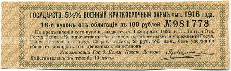 Купон от облигации 100 рублей 1916 года «Государственный военный краткосрочный заем» (Артикул: K10-12872): подробные характеристики, качественные фотографии в высоком разрешении, низкая цена.