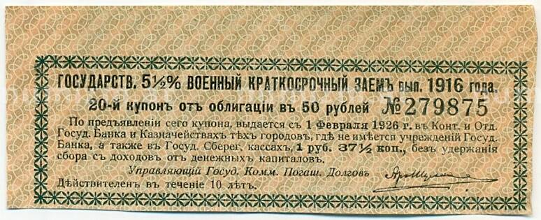 Купон от облигации 50 рублей 1916 года «Государственный военный краткосрочный заем» (Артикул: K10-12881): подробные характеристики, качественные фотографии в высоком разрешении, низкая цена.