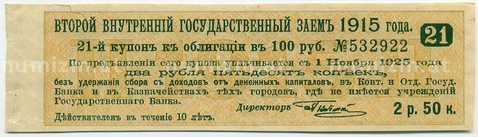 Интернет магазин «Нумизмат» предлагает приобрести Купон от облигации 100 рублей 1915 года «Второй внутренний государственный заем».