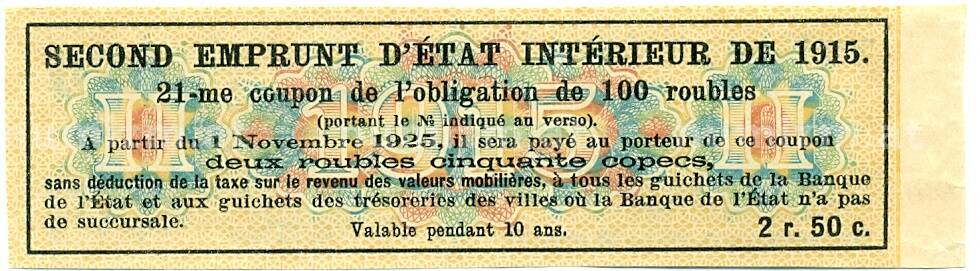 Купон от облигации 100 рублей 1915 года «Второй внутренний государственный заем» (Артикул: K10-12883): подробные характеристики, качественные фотографии в высоком разрешении, низкая цена.