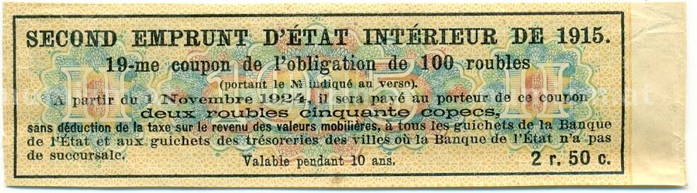 Купон от облигации 100 рублей 1915 года «Второй внутренний государственный заем» (Артикул: K10-12886): подробные характеристики, качественные фотографии в высоком разрешении, низкая цена.