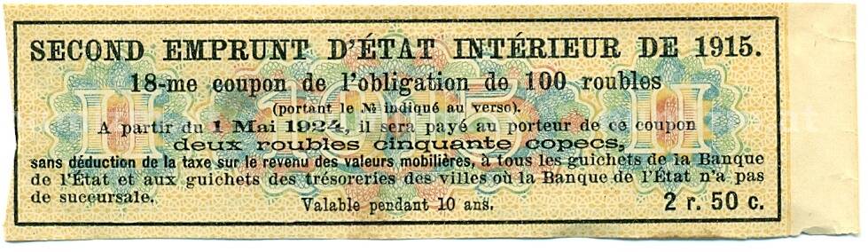 Купон от облигации 100 рублей 1915 года «Второй внутренний государственный заем» (Артикул: K10-12887): подробные характеристики, качественные фотографии в высоком разрешении, низкая цена.