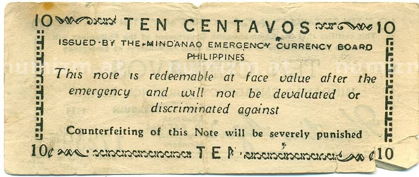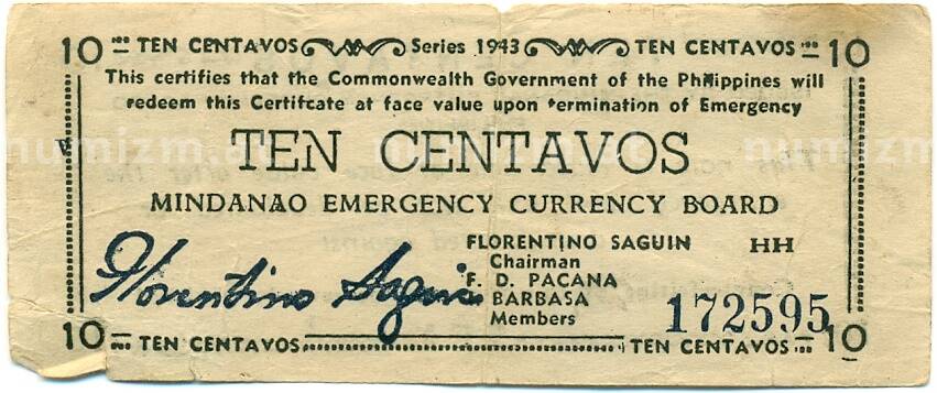 Банкнота 10 сентаво 1943 года Филиппины — провинция Минданао (Артикул: K10-12894): подробные характеристики, качественные фотографии в высоком разрешении, низкая цена.