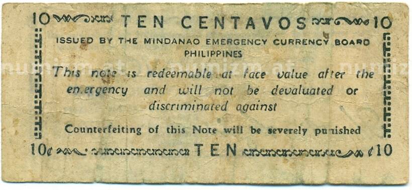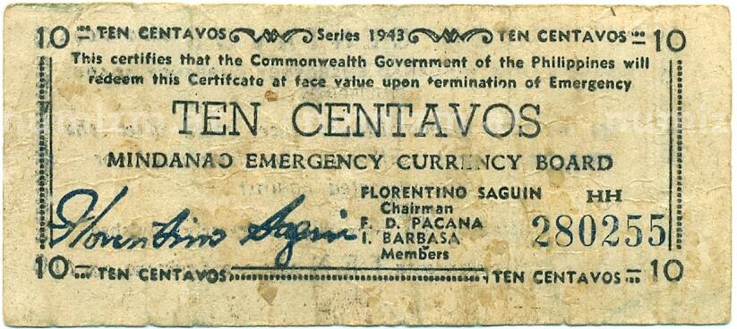 Банкнота 10 сентаво 1943 года Филиппины — провинция Минданао (Артикул: K10-12897): подробные характеристики, качественные фотографии в высоком разрешении, низкая цена.