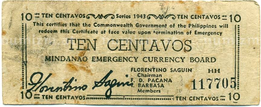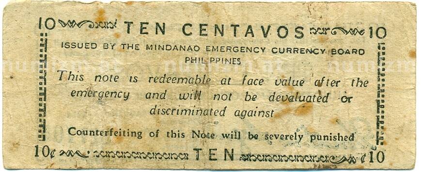 Банкнота 10 сентаво 1943 года Филиппины — провинция Минданао (Артикул: K10-12903): подробные характеристики, качественные фотографии в высоком разрешении, низкая цена.