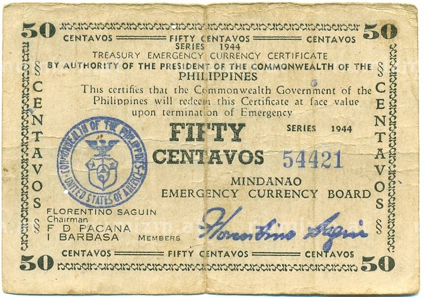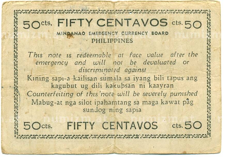 Банкнота 50 сентаво 1944 года Филиппины — провинция Минданао (Артикул: K10-12922): подробные характеристики, качественные фотографии в высоком разрешении, низкая цена.
