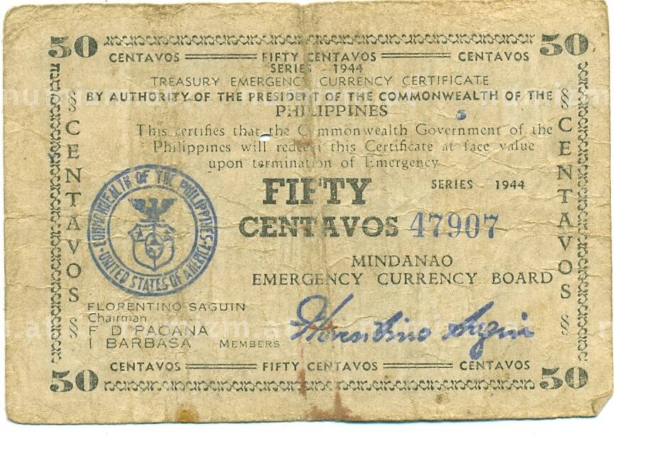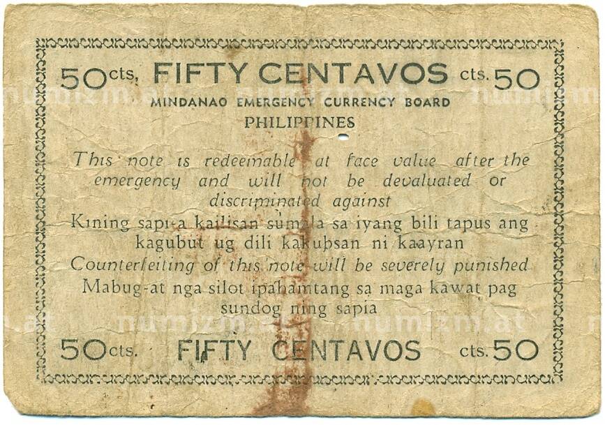 Банкнота 50 сентаво 1944 года Филиппины — провинция Минданао (Артикул: K10-12923): подробные характеристики, качественные фотографии в высоком разрешении, низкая цена.