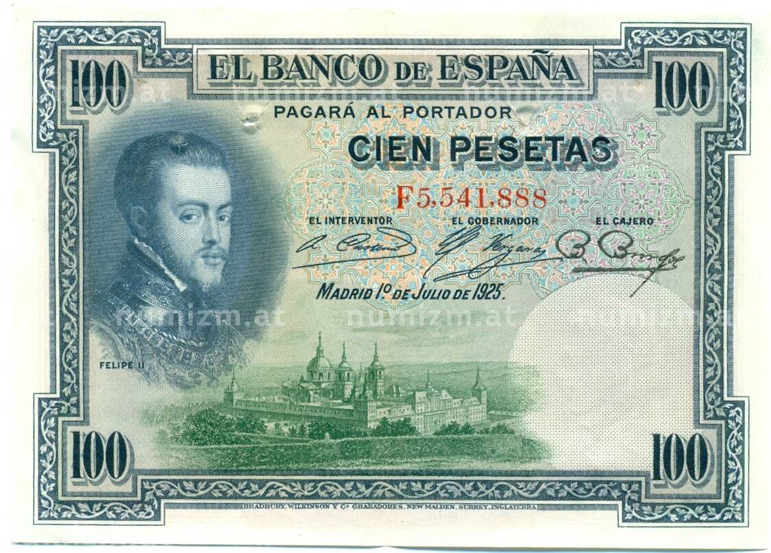 Интернет магазин «Нумизмат» предлагает приобрести 100 песет 1925 года Испания (Гашение).