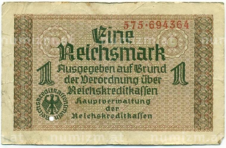 Банкнота 1 рейхсмарка 1939 года Германия (Для оккупированных территорий) (Артикул: K10-12945): подробные характеристики, качественные фотографии в высоком разрешении, низкая цена.