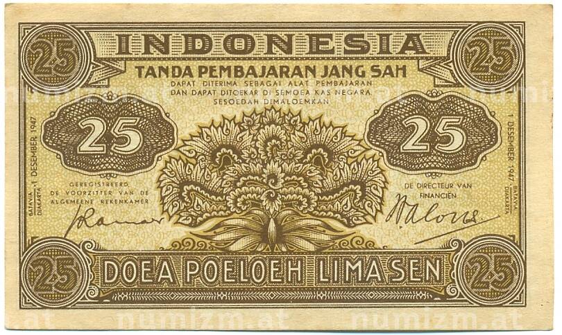 20.01.2025Интернет магазин «Нумизмат» предлагает приобрести 25 сен 1947 года Индонезия.