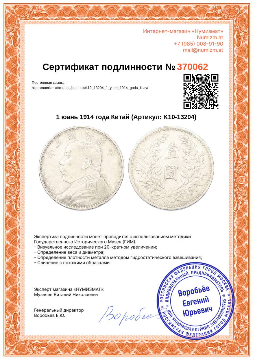 Интернет магазин «Нумизмат» предлагает приобрести 1 юань 1914 года Китай.