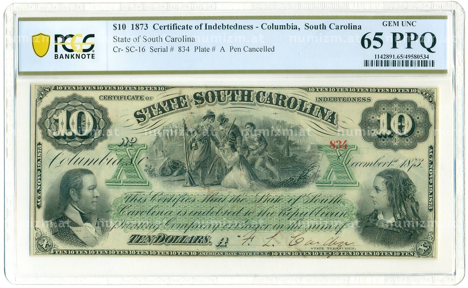 Купить Сертификат задолженности 10 долларов 1873 года США (Южная Каролина) — в слабе PCGS (GEM UNC 65 PPQ) по привлекательной цене можно в нашем интернет-магазине — Вам достаточно оформить заказ на сайте. Все монеты, представленные в каталоге, находятся в наличии на нашем складе.