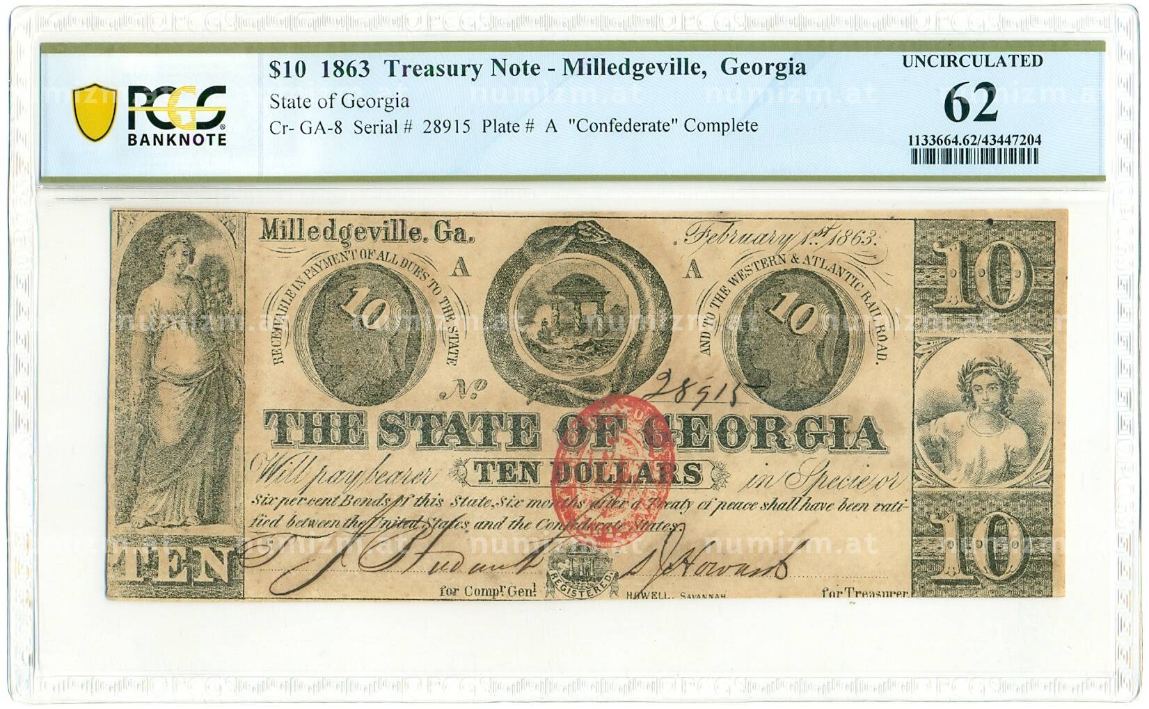 Купить 10 долларов 1863 года США (Джорджия) — в слабе PCGS (UNC 62) по привлекательной цене можно в нашем интернет-магазине — Вам достаточно оформить заказ на сайте. Все монеты, представленные в каталоге, находятся в наличии на нашем складе.