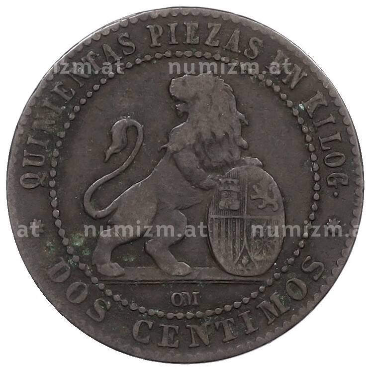 Интернет магазин «Нумизмат» предлагает приобрести 2 сентимо 1870 года Испания.