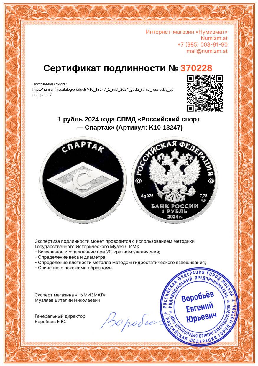 20.01.2025Интернет магазин «Нумизмат» предлагает приобрести 1 рубль 2024 года СПМД «Российский спорт — Спартак».