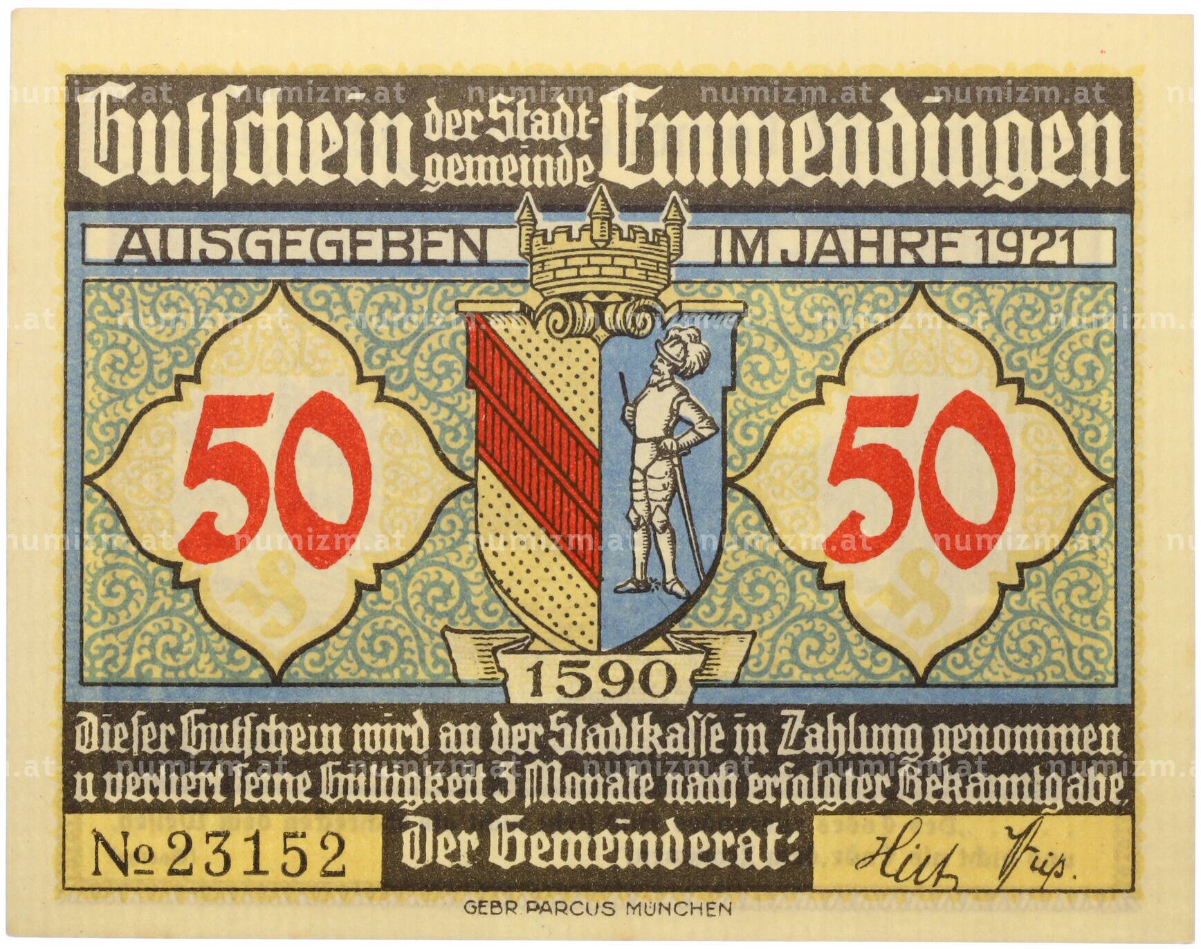 Банкнота 50 пфеннигов 1921 года Германия — город Эммендинген (Нотгельд) (Артикул: K10-13683): подробные характеристики, качественные фотографии в высоком разрешении, низкая цена.