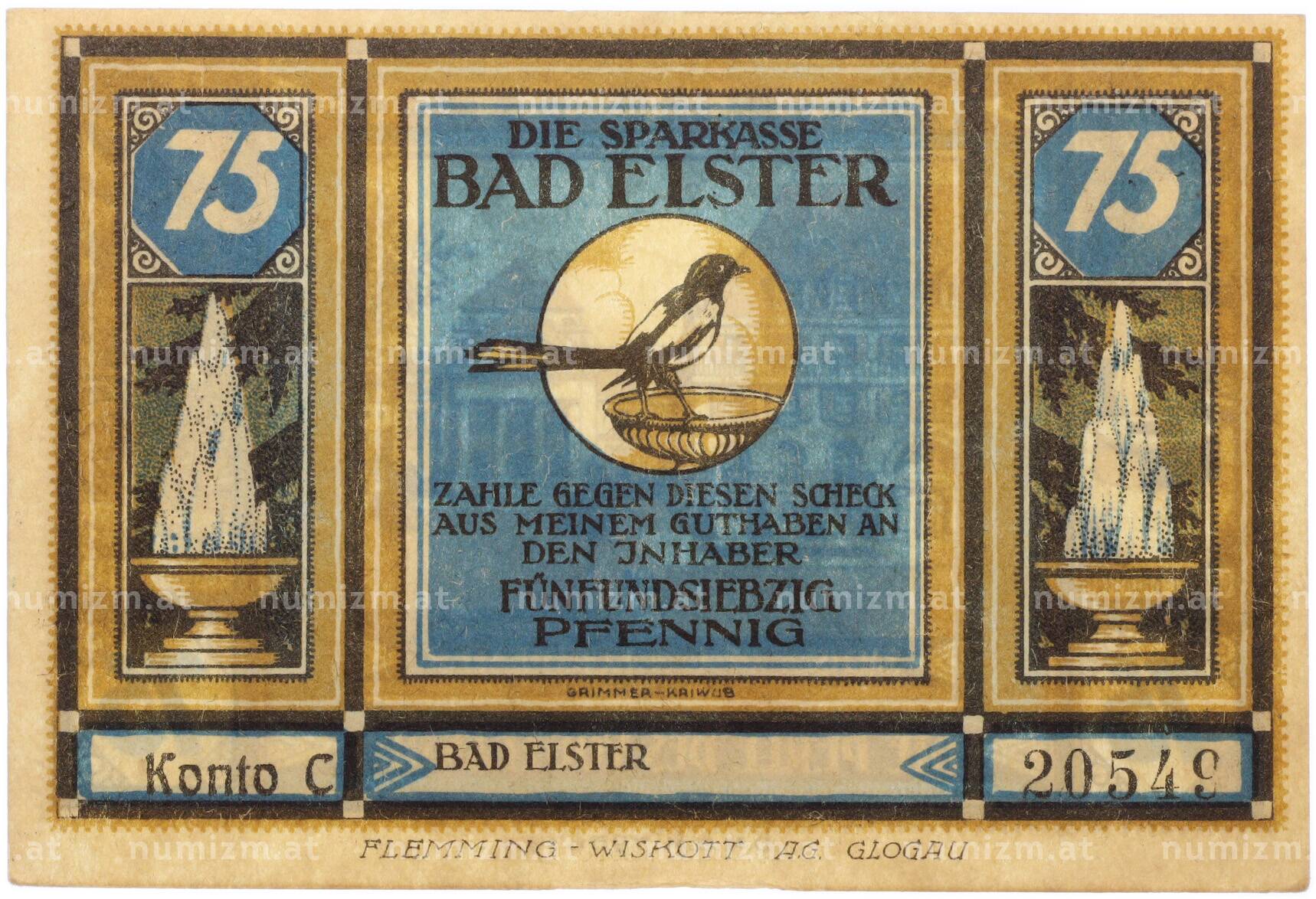 Банкнота 75 пфеннигов 1922 года Германия — муниципалитет Бад-Эльстер (Нотгельд) (Артикул: K10-13695): подробные характеристики, качественные фотографии в высоком разрешении, низкая цена.