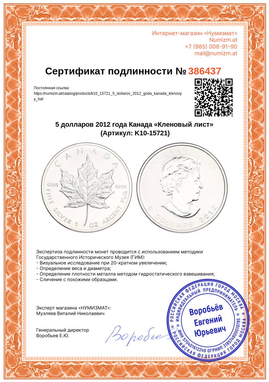 20.01.2025Интернет магазин «Нумизмат» предлагает приобрести 5 долларов 2012 года Канада «Кленовый лист».