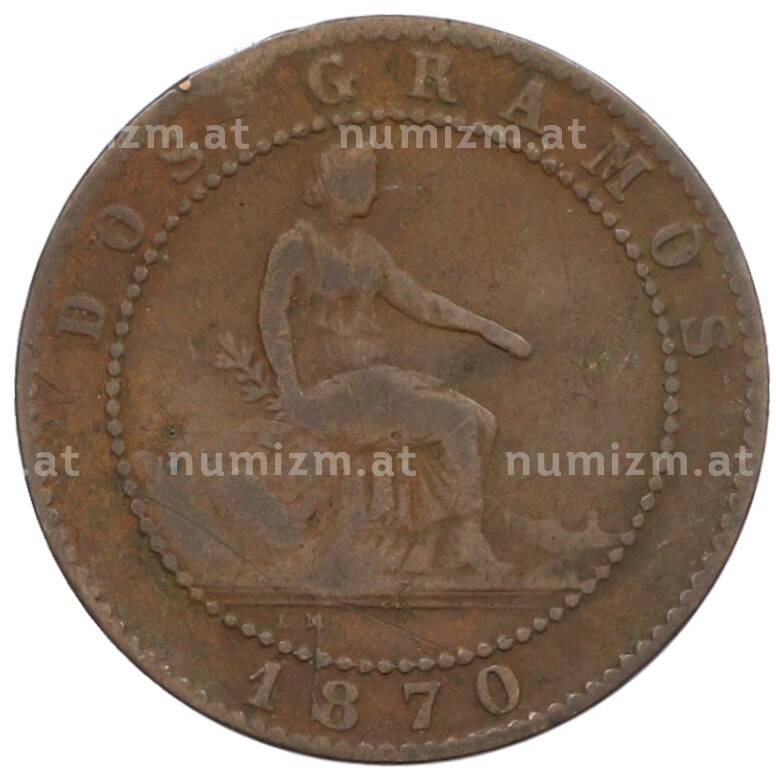 Монета 2 сентимо 1870 года Испания (Артикул: K10-1803): подробные характеристики, качественные фотографии в высоком разрешении, низкая цена.