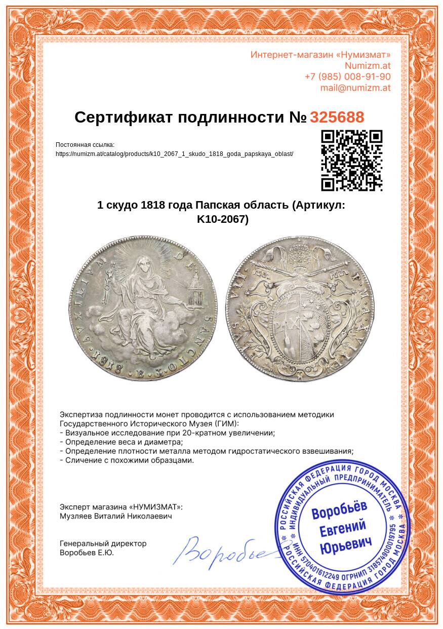 20.01.2025Интернет магазин «Нумизмат» предлагает приобрести 1 скудо 1818 года Папская область.