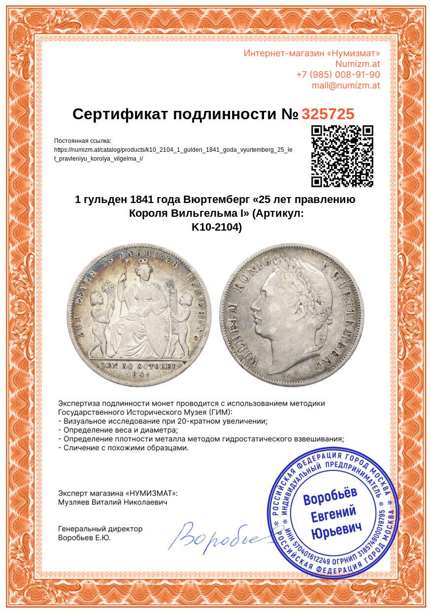 20.01.2025Интернет магазин «Нумизмат» предлагает приобрести 1 гульден 1841 года Вюртемберг «25 лет правлению Короля Вильгельма I».