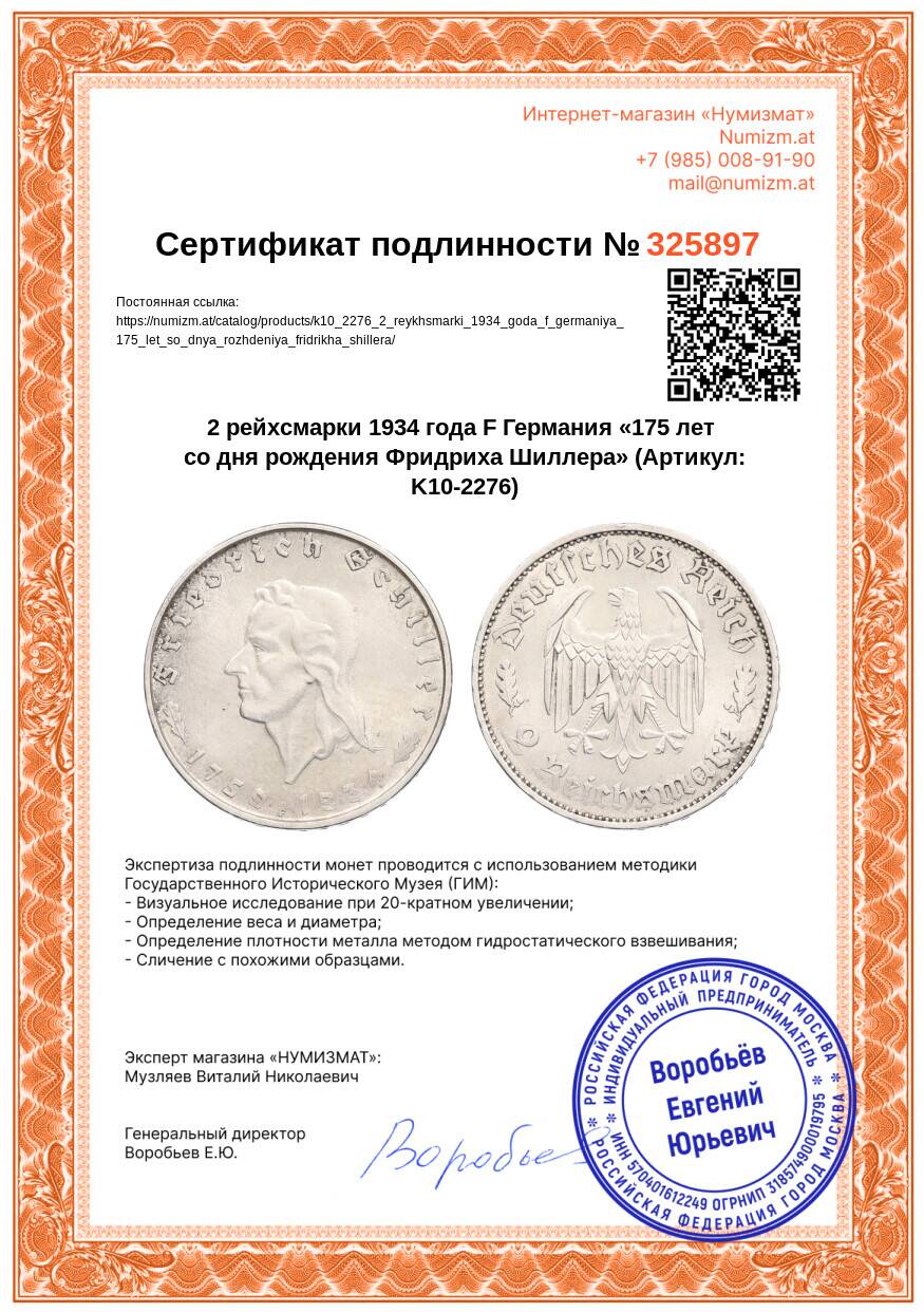 Купить 2 рейхсмарки 1934 года F Германия «175 лет со дня рождения Фридриха Шиллера» по привлекательной цене можно в нашем интернет-магазине — Вам достаточно оформить заказ на сайте. Все монеты, представленные в каталоге, находятся в наличии на нашем складе.