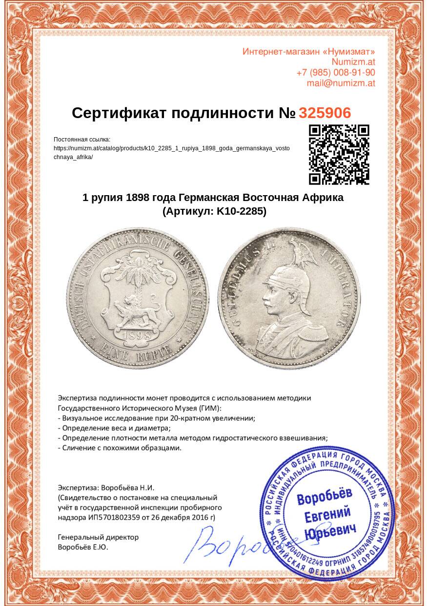20.01.2025Интернет магазин «Нумизмат» предлагает приобрести 1 рупия 1898 года Германская Восточная Африка.