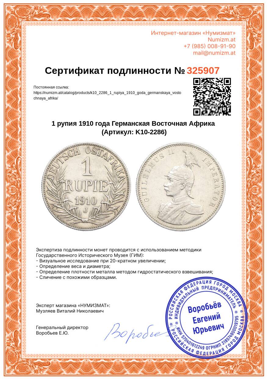 20.01.2025Интернет магазин «Нумизмат» предлагает приобрести 1 рупия 1910 года Германская Восточная Африка.