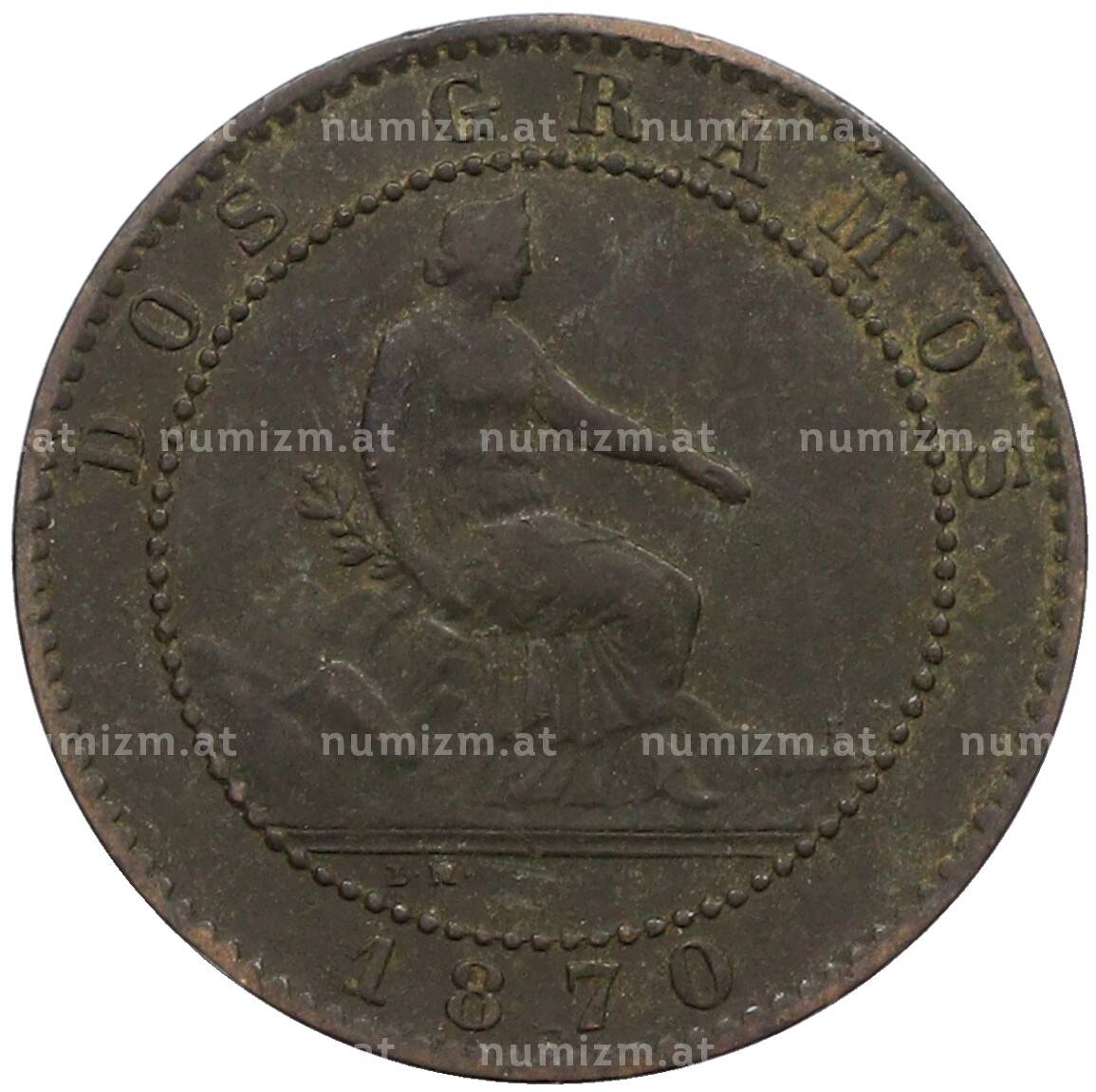 Монета 2 сентимо 1870 года Испания (Артикул: K10-2603): подробные характеристики, качественные фотографии в высоком разрешении, низкая цена.