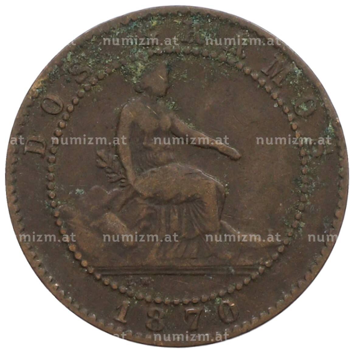 Монета 2 сентимо 1870 года Испания (Артикул: K10-2607): подробные характеристики, качественные фотографии в высоком разрешении, низкая цена.